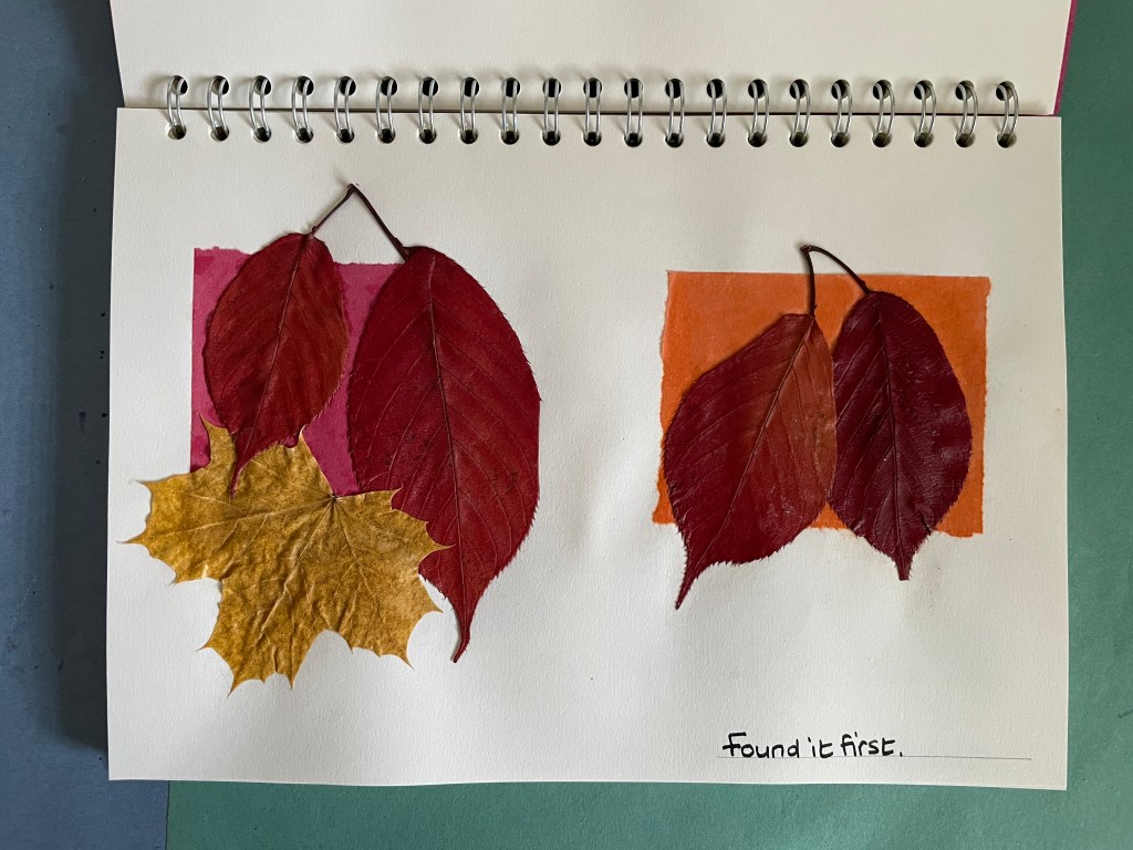 Today is a real experiment sticking leaves into a collage with Acrylic medium to see if they will adhere to the paper surface. Also, I want to test to see if the colours stay or fade away.