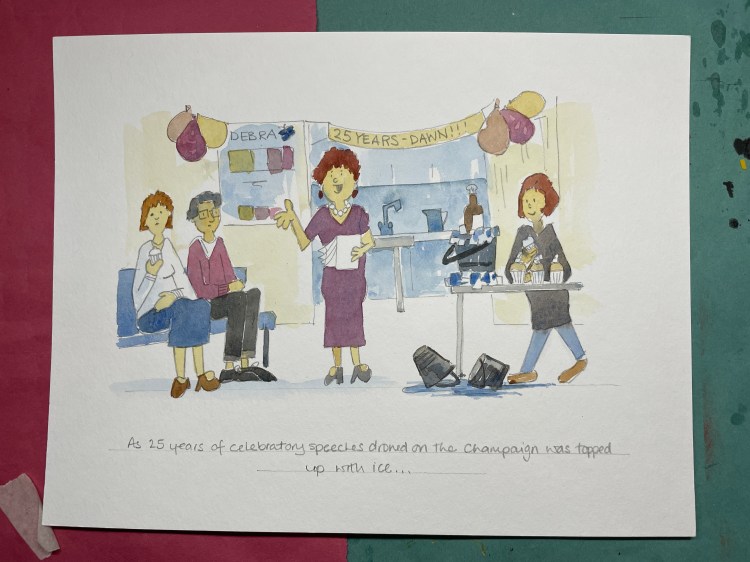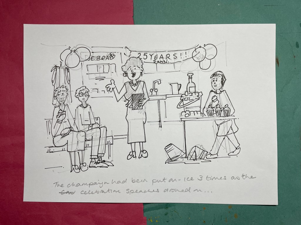 The cartoon started with a simple thought – Dawn can also talk a lot…She is going to hate me for saying that, but it generated a beautiful idea – long winded speeches and Celebratory champaign being topped up with ice.