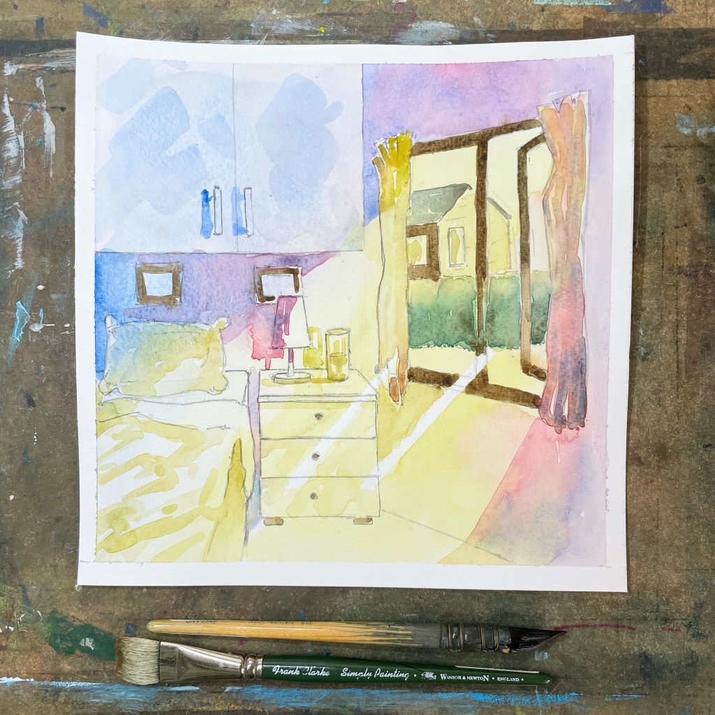 I try to harmonise my paintings these days, starting with an all over wash and then choosing to darken areas and get the watercolour contrast. This is an image of a interior of a caravan on the Heritage park in Stepaside in Wales.