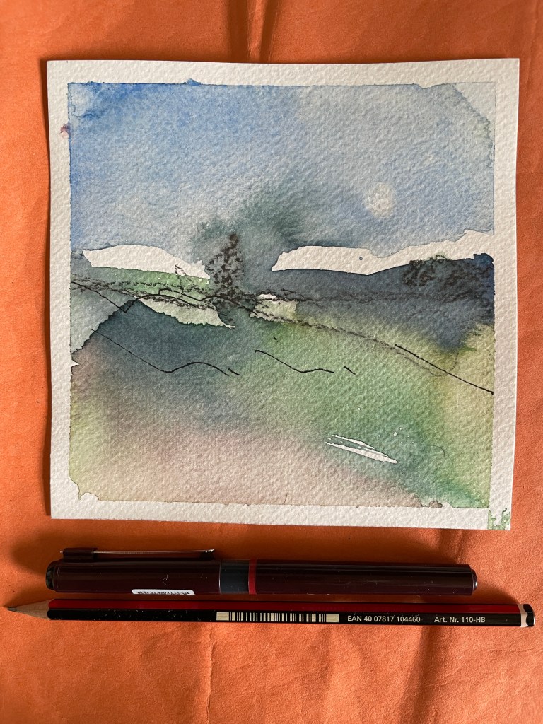 This is a complete experiment using a very random technique that I picked up from a youtube video entitled – Got PAINTERS BLOCK? Try this 5 MINUTE Loose Watercolor Landscape Painting Exercise, Lots of Fun!