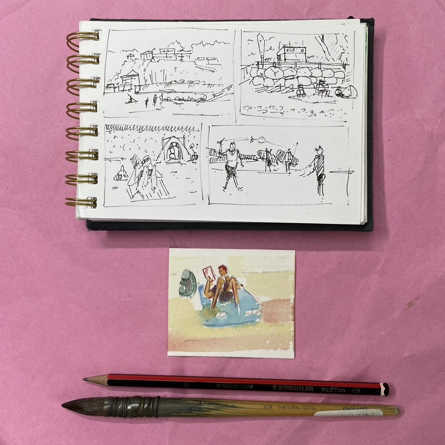 The original sketch featured a beach tent in the background. This would have confused the painting and added too much detail, distracting from the main subject. I’ve developed the rucksack from the sketch to give some balance to the image.