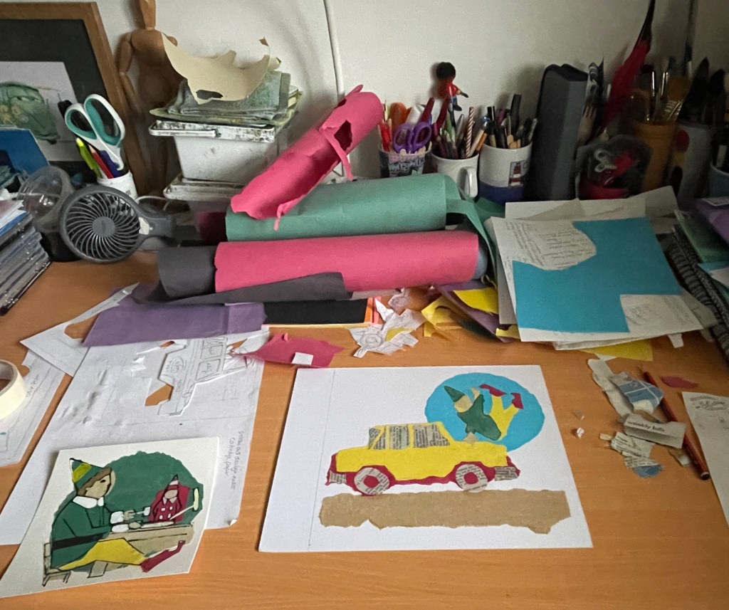 The shapes are laid out on a support, generally mount board. And then glued down with Acrylic Matt medium, it dries waterproof and unlike PVA glue leaves a matt surface I can draw on.
