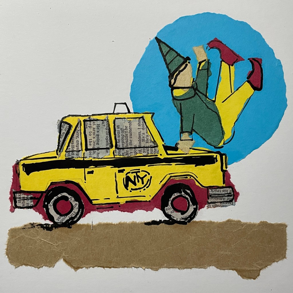 I decided to use my left hand while drawing to music. I covered my paper in sugar paper collage and then taking a line for a walk a let myself have free expression to the music I was listening too.