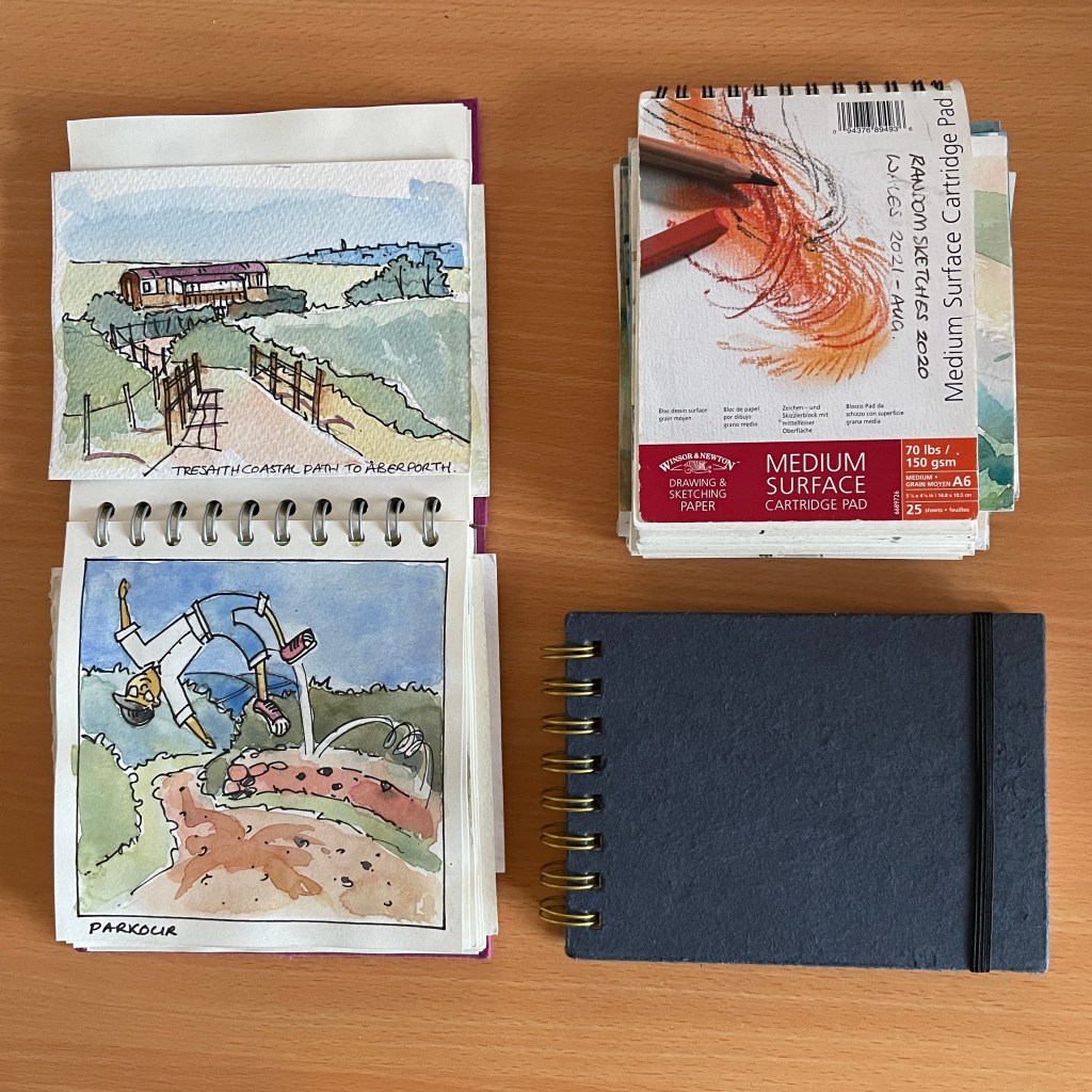 I like to keep a variety of sketchbooks on the go in sizes from A6 to A3. My favourite manufacturer is Windsor and Newton whose wiro-bound sketchbooks come in various sizes and textures. The only way to improve their sketchbooks is with a piece of elastic to keep the pages closed while out sketching in the field…and voilà – Artway available from Amazon have the perfect sketchbook!