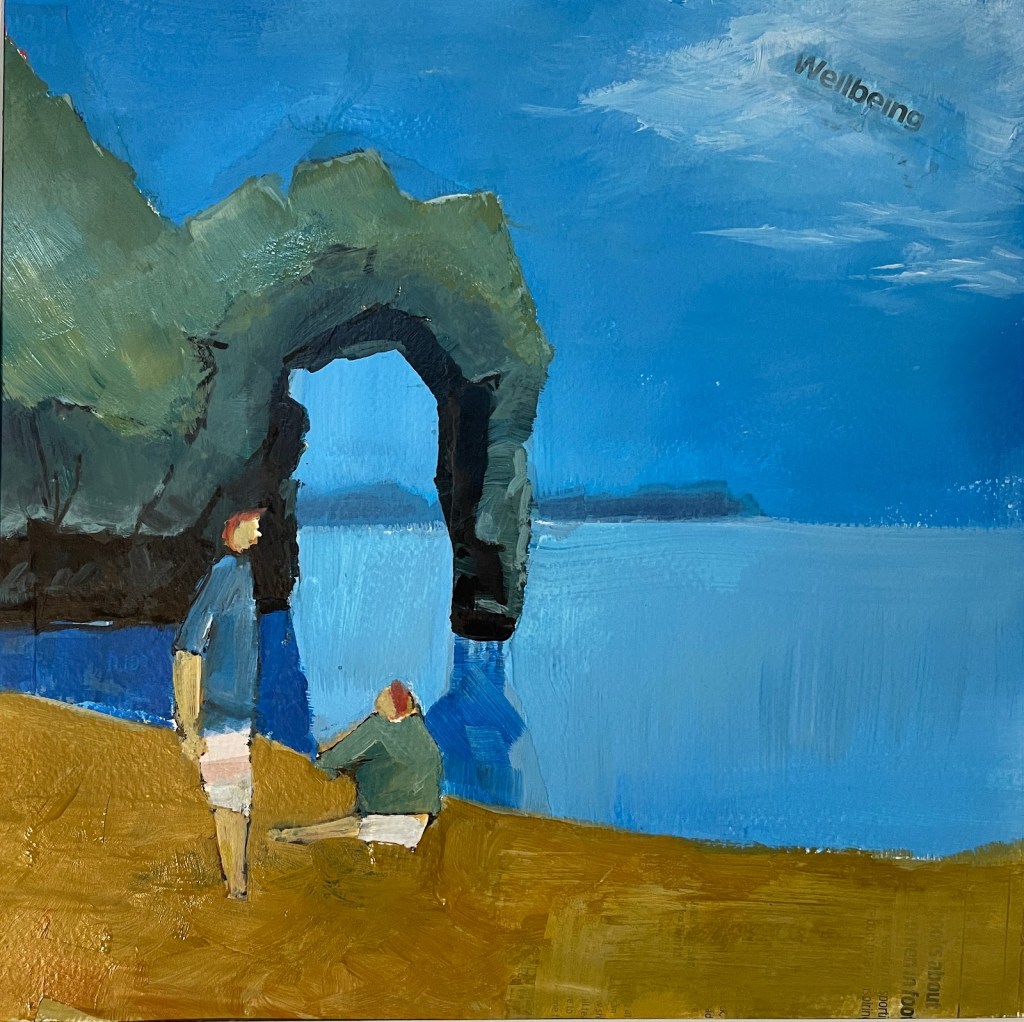 Rather than creating an image of a scene – Linda’s technique produces an abstract landscape that you can then add details too. To find areas of interest I used Mount board to frame small pictures, thinking about the composition of light and what extra’s I could add.